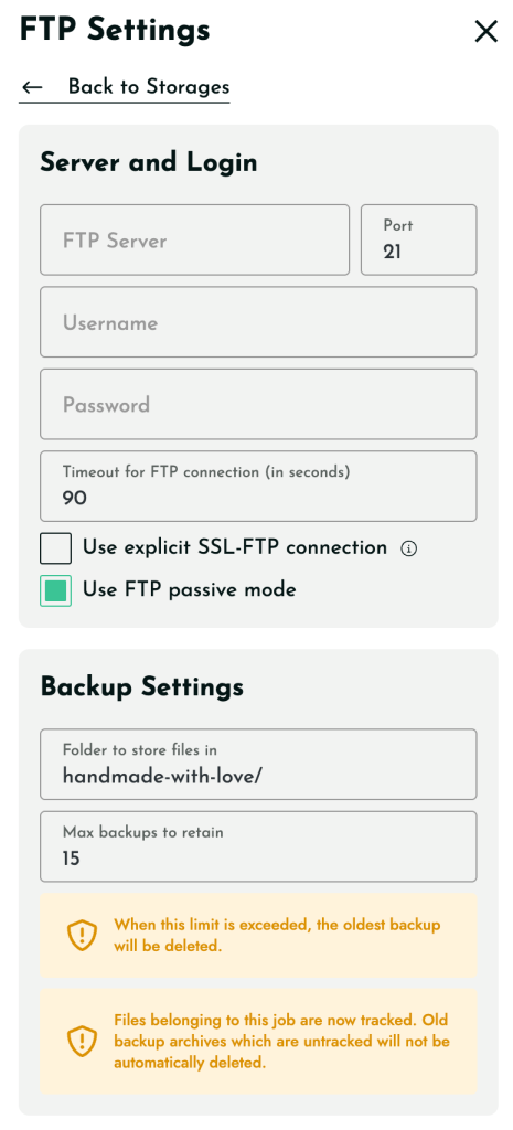 Folder to store files in: Specify the directory path on your FTP server where backups should be saved.