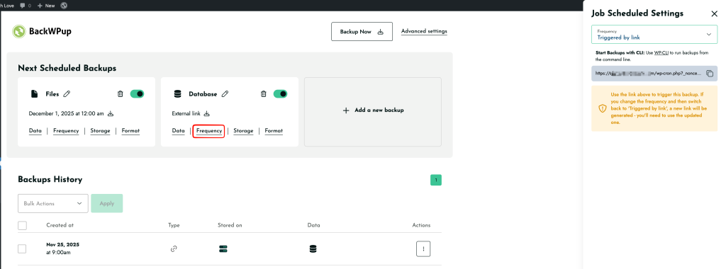 Usage: Visiting this link in a browser, or setting up an external cron job to hit this URL, will immediately start the associated backup job using its customized settings.
