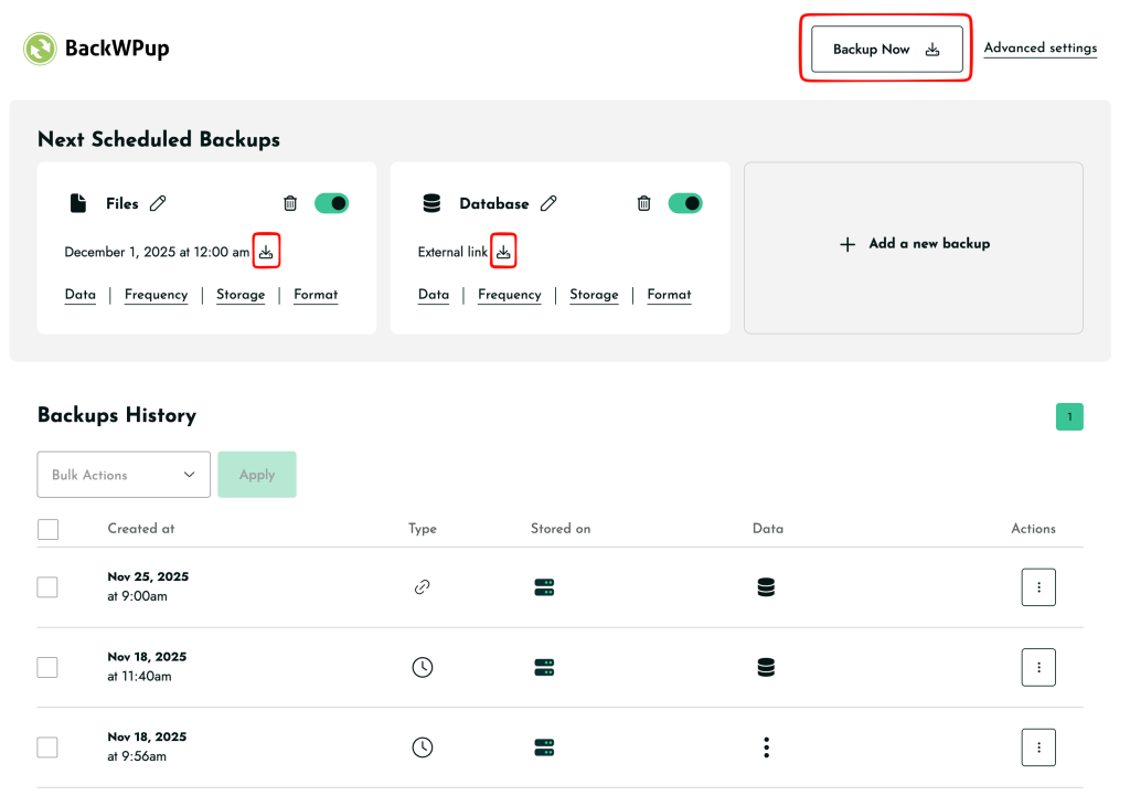 BackWPUp allows you to run backups immediately or automatically on a schedule. You can choose different ways to start and manage your backups based on your needs.